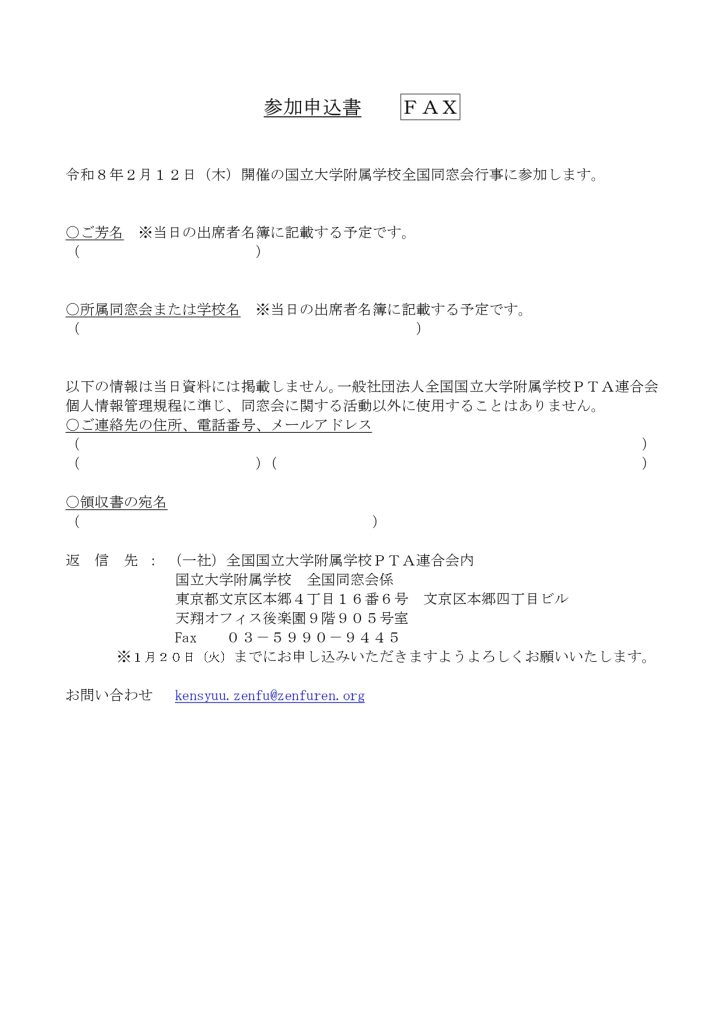国立大学附属学校全国同窓会より標記の会の案内が届きましたので、同窓生の皆様にご案内します。参加を希望される場合は、1月20日までに所定の返信先にFAXでお申し込みください。